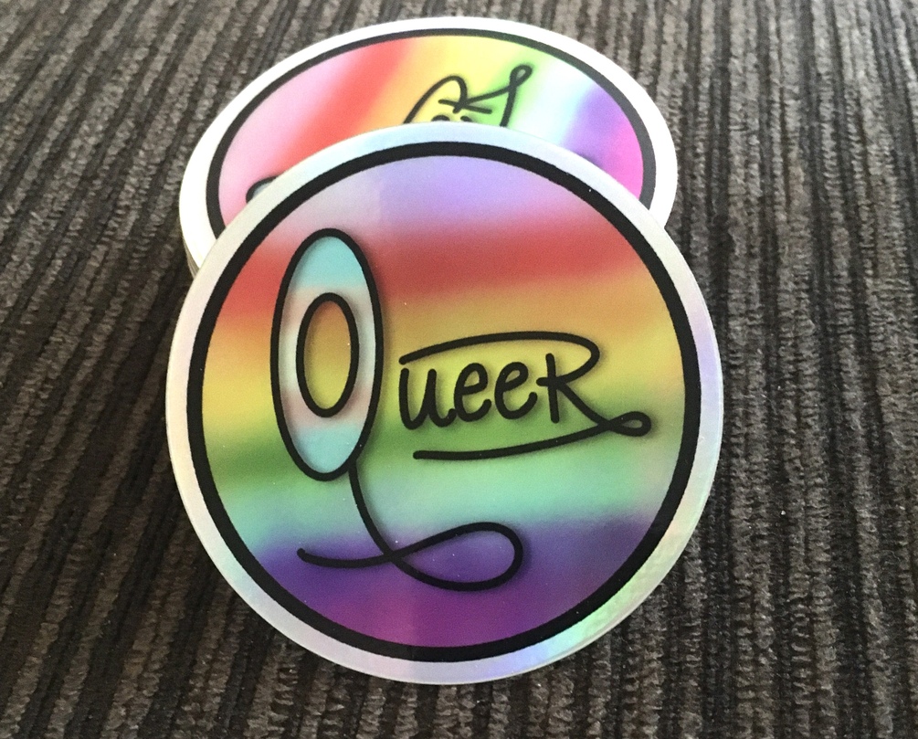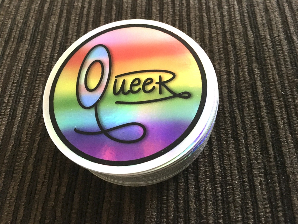 A 3 inch round, holographic sticker with the word “Queer”. Pride flag colors in the background, trans pride colors in the “Q.”