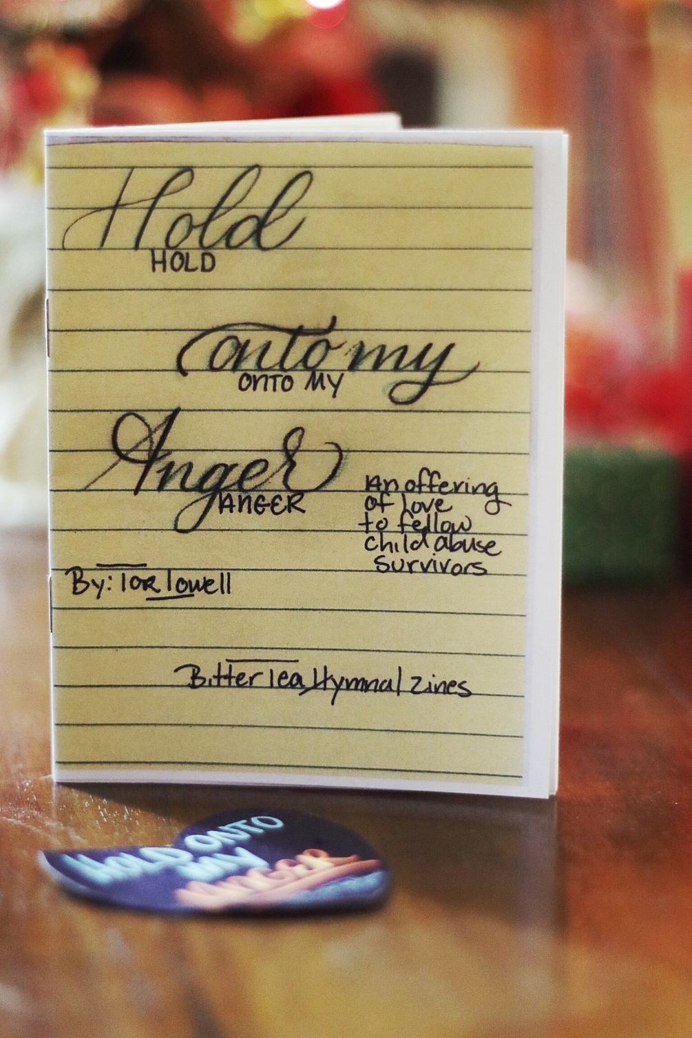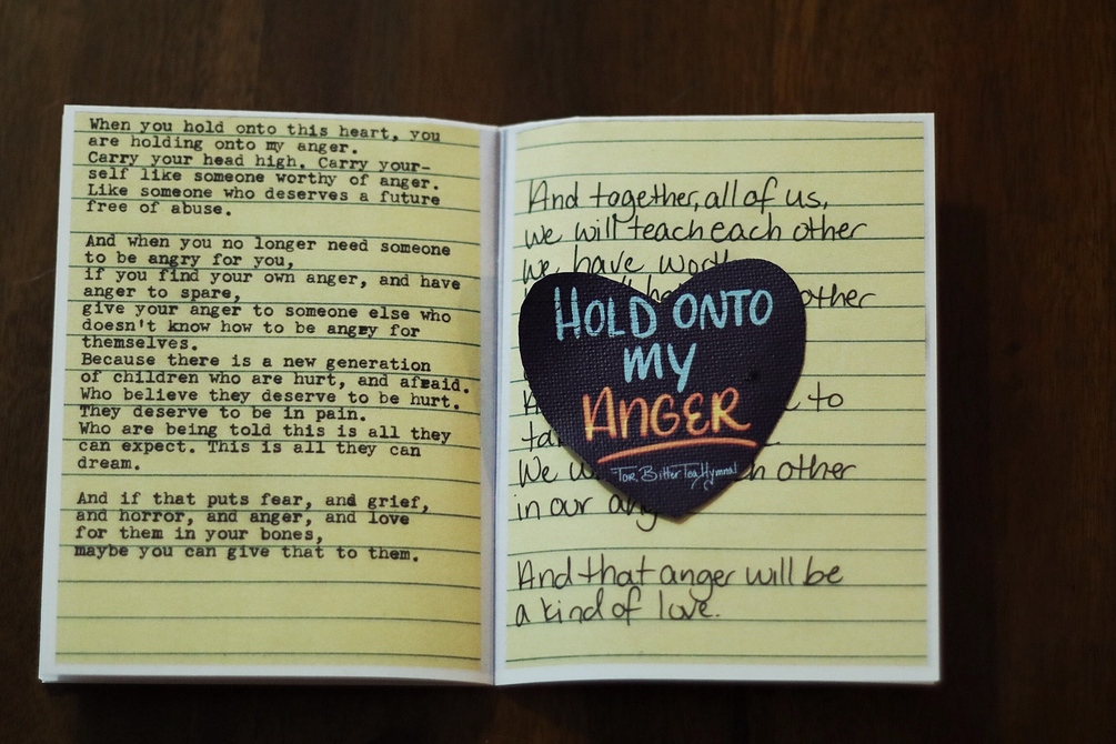 12 page, 1/4 color zine of typewriter-written text on a yellow background, and a heart shaped print of the words, “hold onto my anger” on canvas
